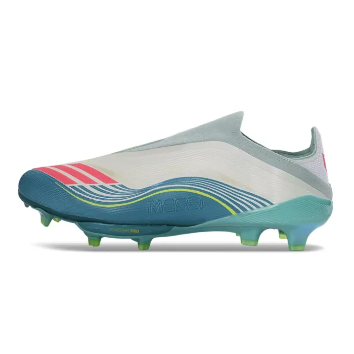 The adidas F50+ Elite Laceless FG arrives in a clean Footwear White base with a soft aqua gradient and bold Lucid Pink stripes—Miami through a pastel lens. Tailored to Leo’s preferences, it features a Fibertouch upper, his favoured knit “burrito” tongue, and Sprintframe 360 soleplate for explosive acceleration on firm ground. Two sockliners let you switch between speed or comfort.